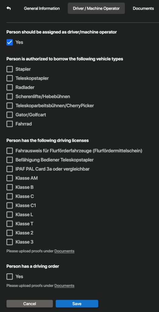Wählen Sie dazu das Teammitglied aus, dass sie als Fahrer einsetzen möchten, und gehen Sie in den Reiter Driver/Machine Operator. Durch Klick auf Edit und die Bestätigung, dass diese Person als Fahrer/Maschinenführer eingesetzt werden soll, öffnen sich verschiedene Auswahloptionen