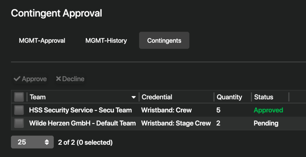 Um die angefragten Kontingente einzusehen, wählen Sie den Reiter Contingents. Hier sehen Sie alle Einträge und den jeweiligen Status. Um eine Anfrage zu genehmigen, wählen Sie diese über die Checkbox aus und klicken Sie auf Approve. Um sie abzulehnen klicken Sie auf Decline. Der Status wechselt nun von Pending zu Approved oder Declined. Nach einer Freigabe stehen die Credentials dem Team zur eigenen Zuweisung der Mitarbeiter*innen im Bereich Accreditation > Ceredentials zur Verfügung.